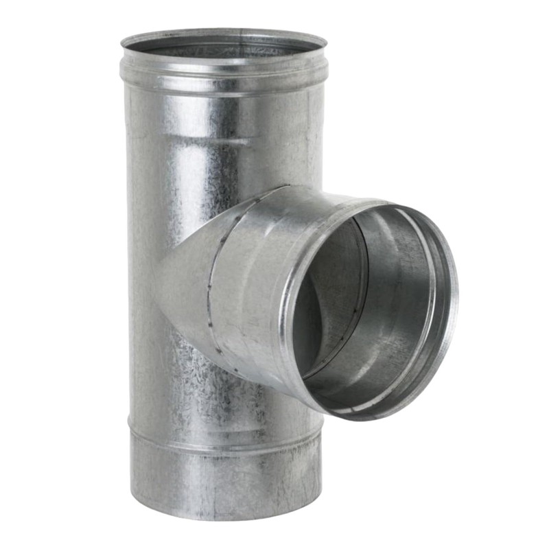 - T-shaped metal pipe connector for ventilation systems.