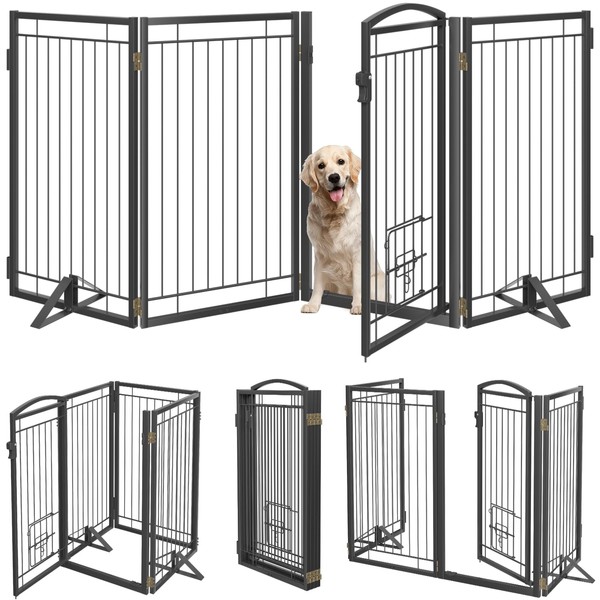Metal Free Standing Dog Gate with Cat Door for Indoor/Outdoor,80" Extra Wide Foldable Pet Gate,36" Tall Puppy Fence for Large Openings Stairs,Deck,Yard,Doorways(4 Panels,Black)