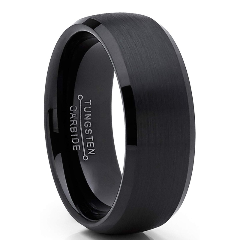 - The featured ring is crafted with weighty and durable genuine tungsten carbide metal ( Cobalt Free). 8mm wide band, black brushed dome center, high polish beveled edges, comfort fit.