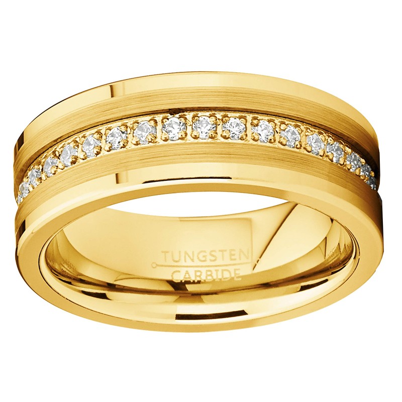 - Showcasing this beautiful flat-top tungsten carbide wedding band. Product features a Goldtone plated brushed band that is 8mm in width. Round-cut cubic zirconia stones adorn the center of this wedding band. This timeless classic ring is ideal as a wedding band or an accessory to your everyday wardrobe.