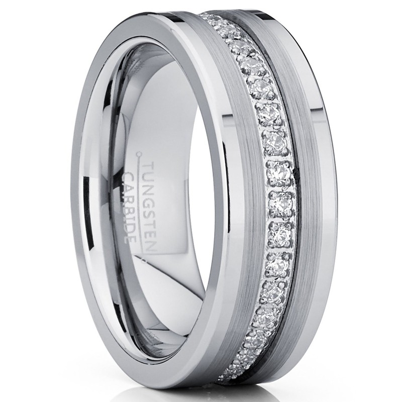 - The featured ring is crafted with weighty and durable genuine tungsten carbide metal ( Cobalt Free). 8mm wide, quality cubic zirconia inlaid center, flat top wedding band, high polish edges, brushed center, comfort fit