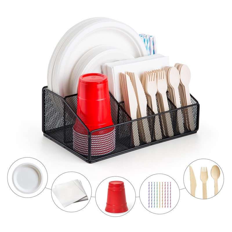 - This paper plate organizer has 6 compartments, it has enough space for plates, cups, napkins, knives, forks, spoons. Keep your countertop clean and organized.
