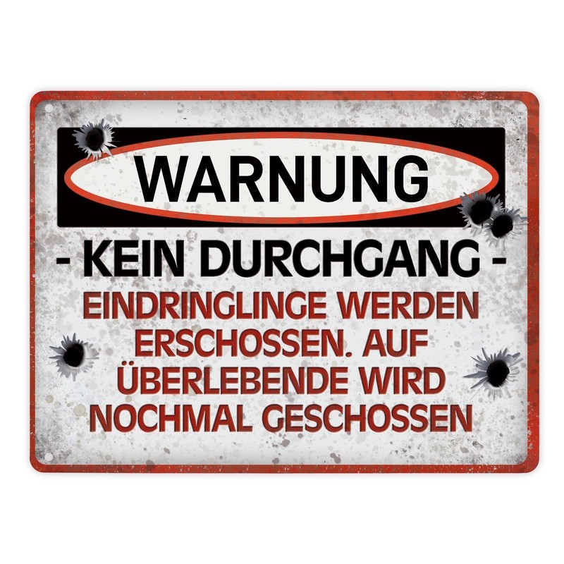 - Box contents: 1 x metal sign XL with bullet holes motif and saying: Warnung - Kein Durchgang ...