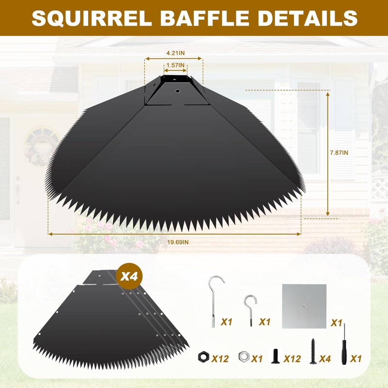- Versatile Installation Options: Our metal squirrel baffle offers multiple installation methods, making it perfect for any bird feeder setup. Whether you're using a bird feeder pole or hanging your feeder, which can be securely installed on 4x4 post or circular wooden poles with diameters ranging from 1.57 inches to 4.2 inches. Baffle can also be assembled into hanging squirrel baffle based on other accessories in the packaging.this squirrel deterrent for bird feeders ensures maximum protection.