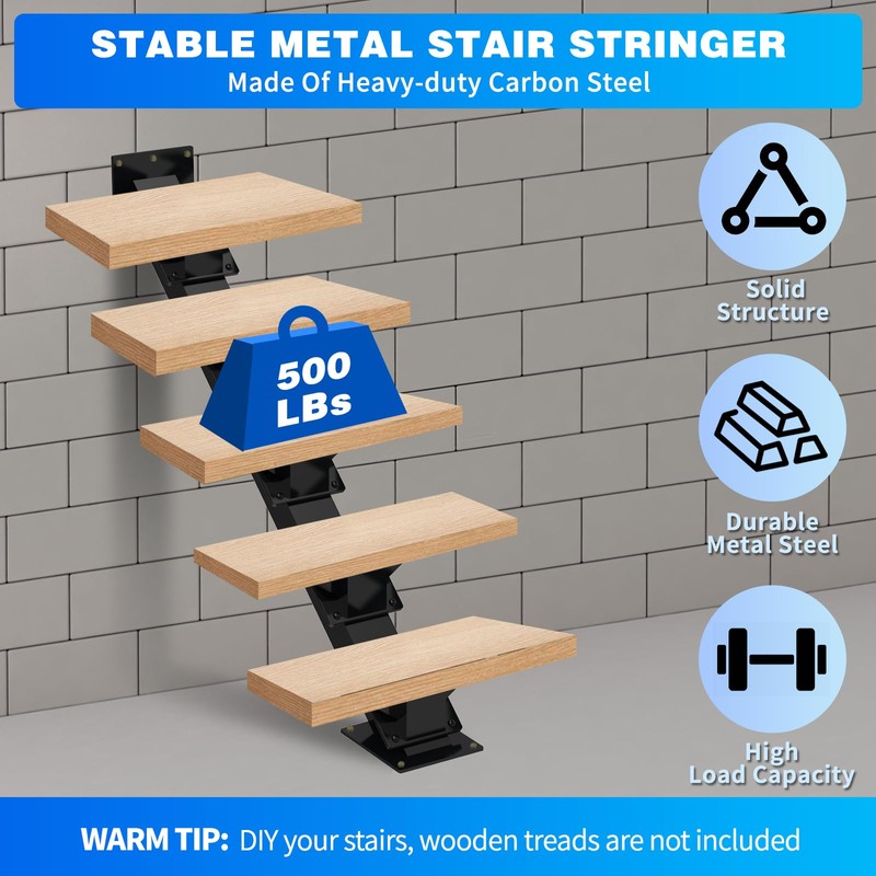 - [Durable Metal Step Stringer] Coated with black powder coating, the step stringer resists rust and weather damage. This not only provides a smooth surface but also makes it suitable for both indoor and outdoor use. It will last longer than other wooden step stringers.