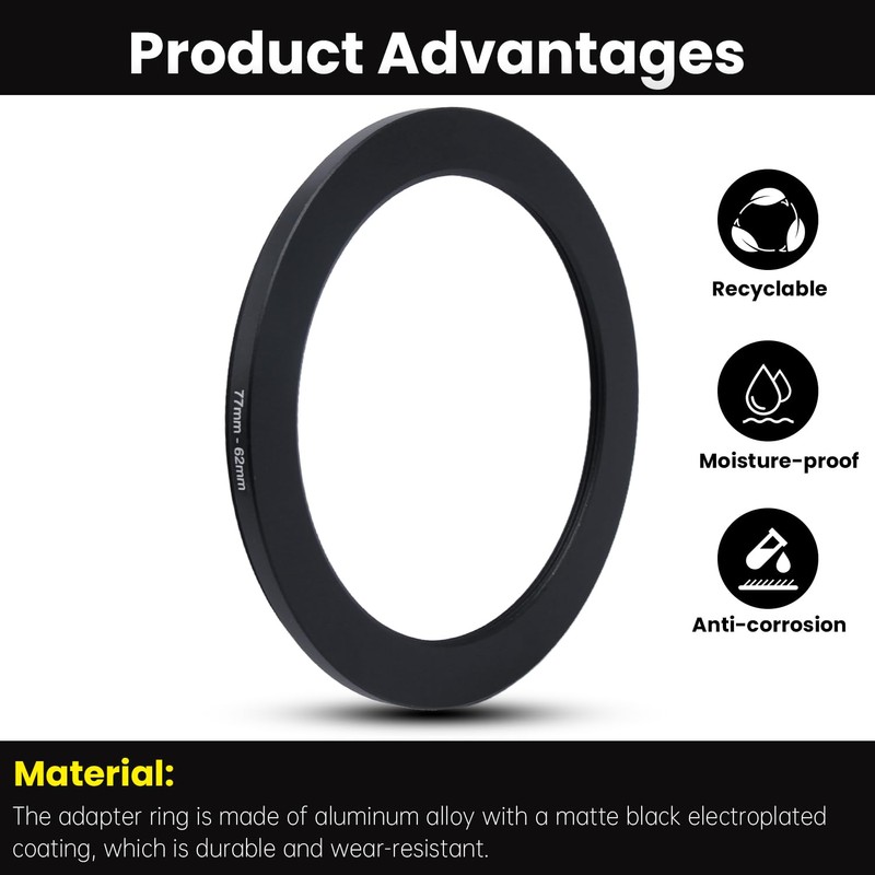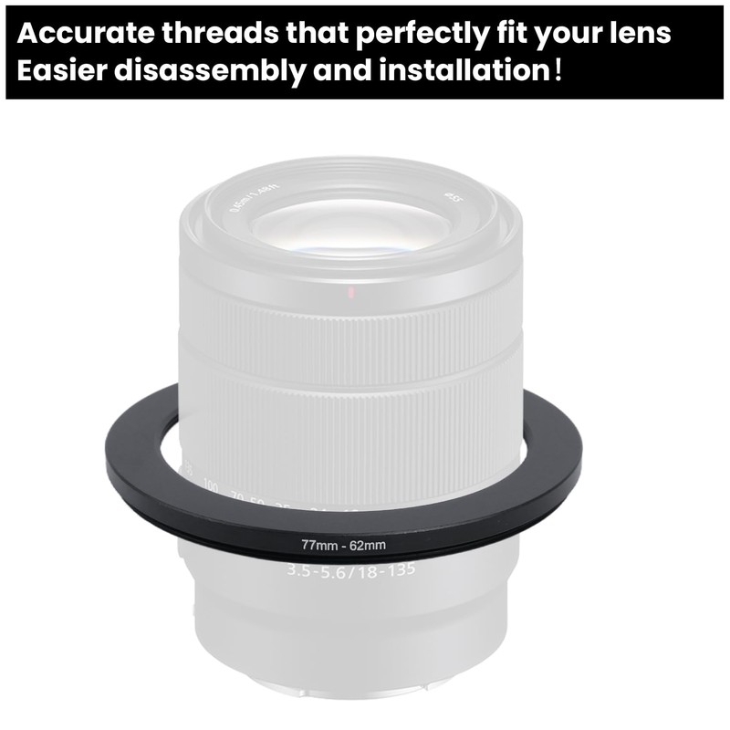 - COMPATIBLE: 77mm to 62mm Step-Down Ring Filter Adapter.