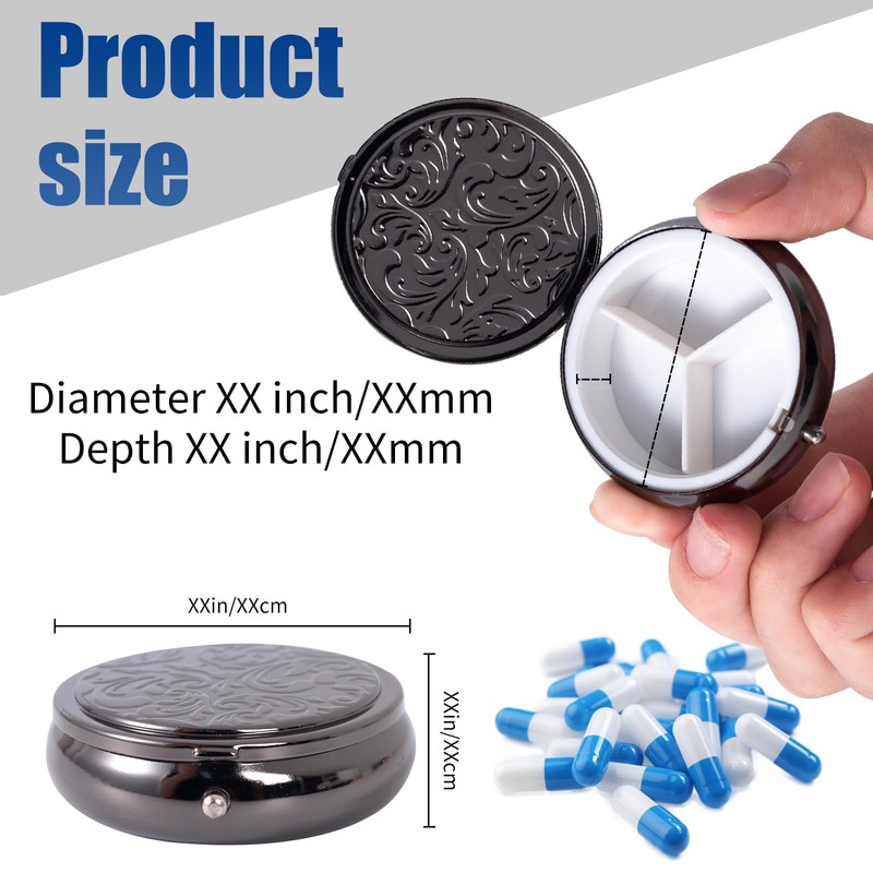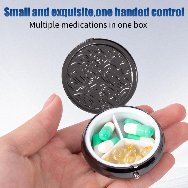 Metal Three Grid Pill Box, Travel Takeaway Pill Box, Mini Metal Pill Box with Patterned Surface (1 Pack Black)