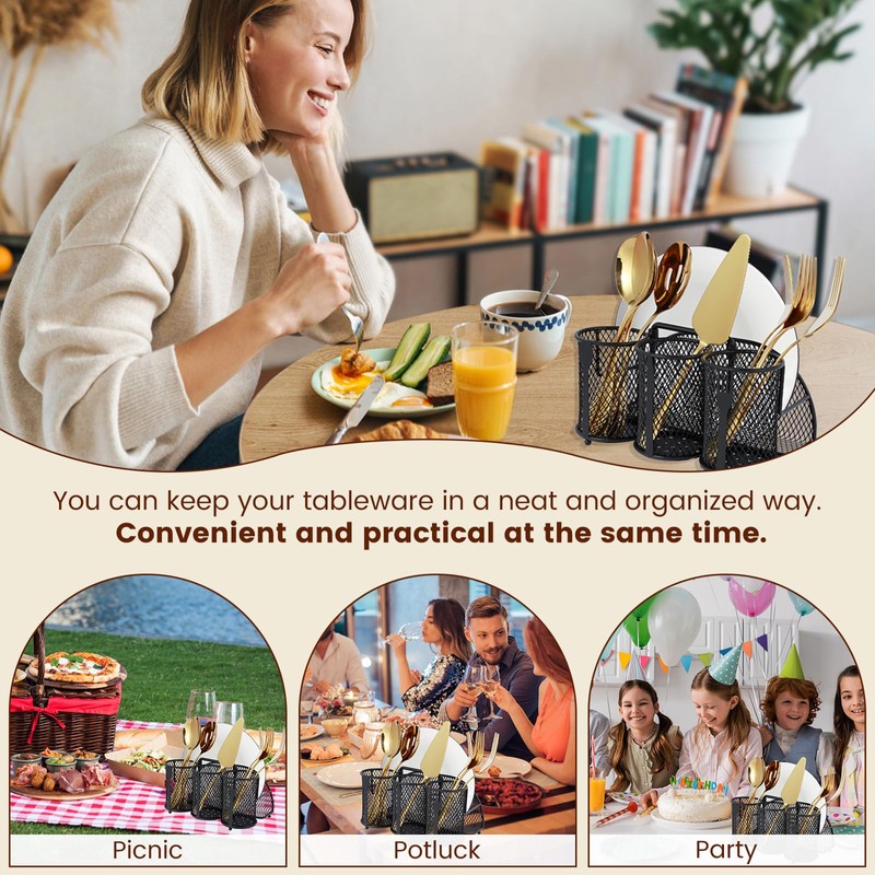 This high-quality metal cutlery caddy is corrosion and rust resistant, no assembly required. The cutlery holder has 4 compartments to keep your cutlery organized and within easy reach. Also, its mesh design keeps cutlery dry, and the metal flatware holder can be rinsed directly with water or wiped with a damp cloth for easy cleaning. The cutlery caddy comes with a retractable handle, making it easy to carry to camping, parties, buffets, picnics, pubs and barbecues use.