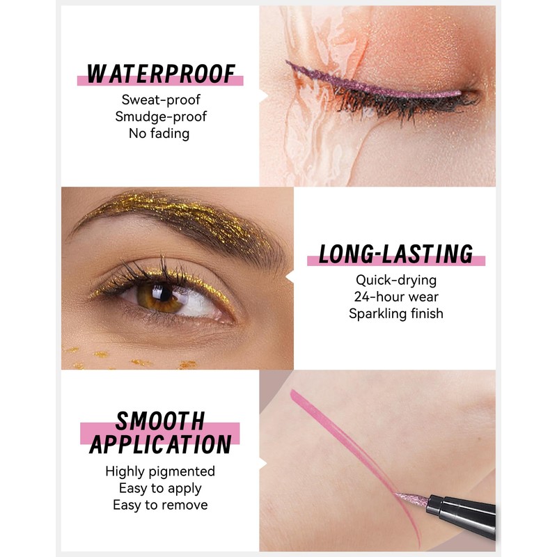 - Metallic Glitter Effect - The shimmer metallic glitter liquid eyeliner is vegan and cruelty-free, lightweight on the eyelids, making it easy to wear all day long. Highly pigmented metallic shimmer adds a unique look to your eyes, brighten your daily eye look, to help you easily create shiny makeup.