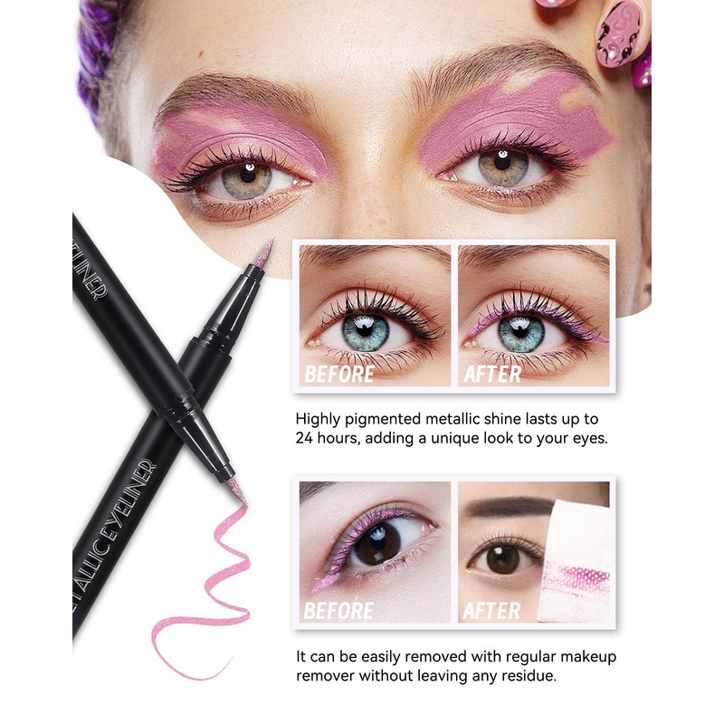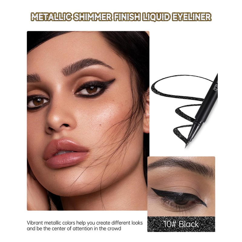 - Metallic Glitter Effect - The shimmer metallic glitter liquid eyeliner is vegan and cruelty-free, lightweight on the eyelids, making it easy to wear all day long. Highly pigmented metallic shimmer adds a unique look to your eyes, brighten your daily eye look, to help you easily create shiny makeup.