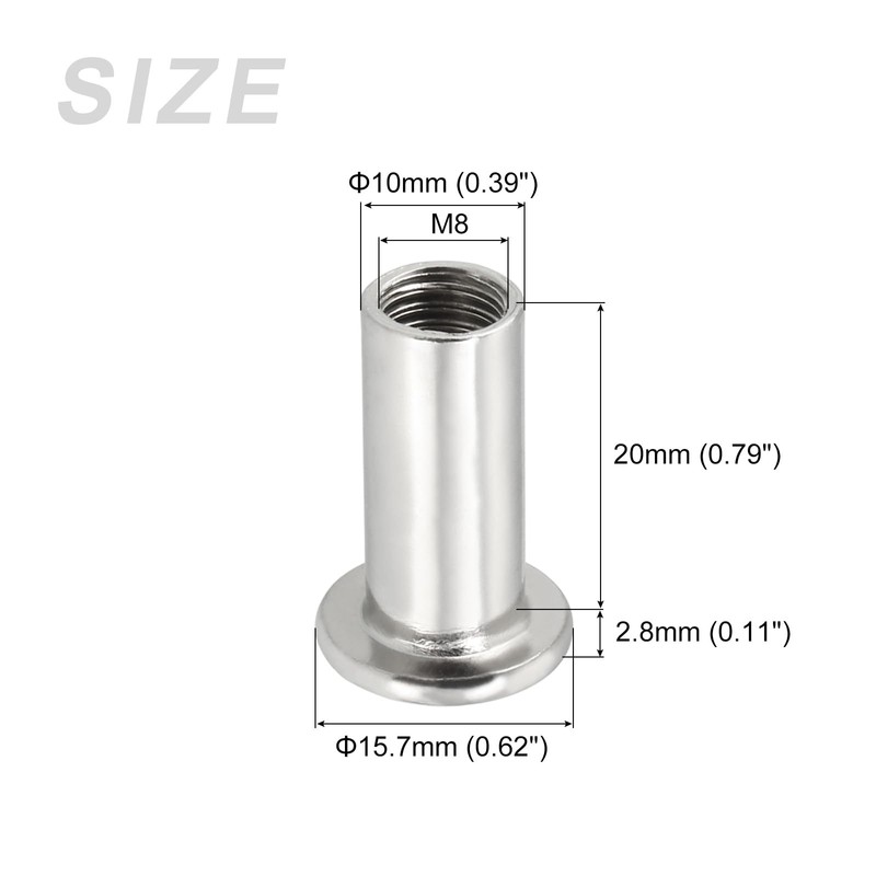 - [2]: Specifications - Female Thread Size: M8(D)x20mm(L); Cap Size: 2.8mm(T)x15.7mm(D)/0.11"x0.62";Sleeve Diameter: 10mm / 0.39";Hex Width: 5mm / 0.2"