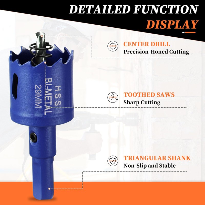 • [2]SPECIFICATION - Hole Saw Diameter: 29mm/(1-1/8"), Cutting Depth: 25mm/(1"), Shank Diameter: 9mm/(0.35"), Total Length: 81mm/(3.19") with Triangular Shank, with 1pc Center Drill Bit Diameter: 5mm/(0.2"), with 1pc Hex Key