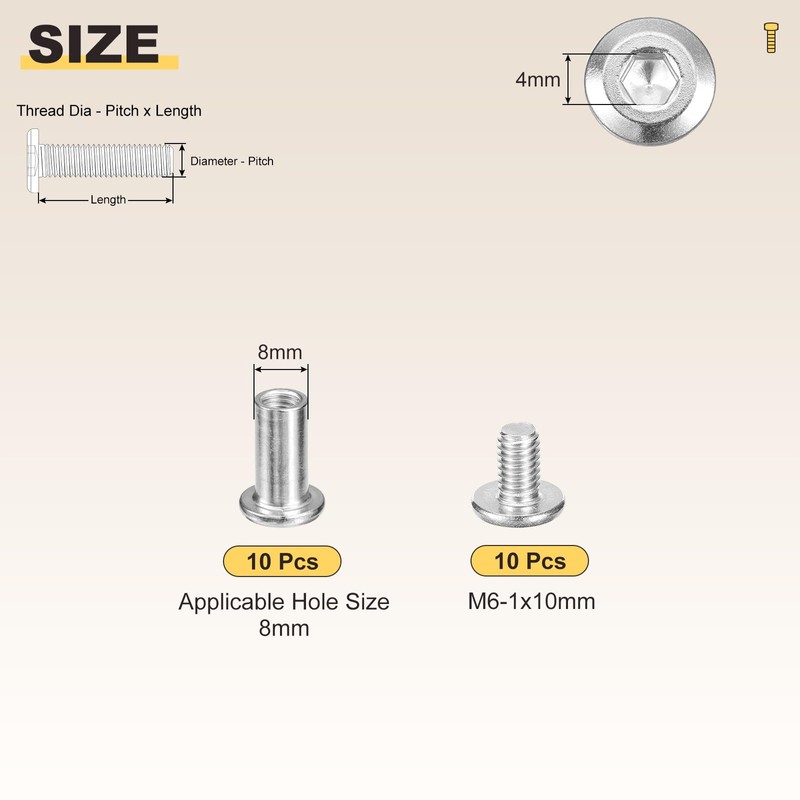 • [2]:SPECIFICATION: Product Name: Barrel Nuts and Flat Head Screws with Wrench; Flat Head Screws Thread; Diameter: M6-1(Thread Dia x Pitch); Flat Head Screws Screw Length(mm):10; Color: Silver; Applicable Hole Size: 8mm; Material: Carbon Steel; QUANTITY INCLUDED - 10Pcs x Flat head socket cap screw - 10Pcs x Barrel Nuts