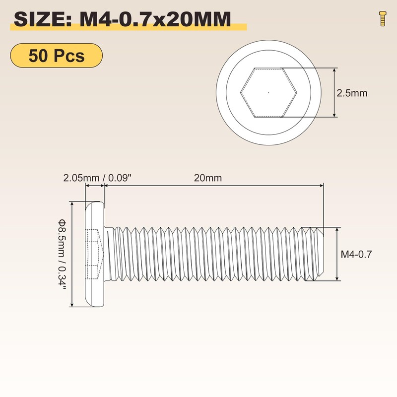 - [2]:SPECIFICATION - Thread Diameter: M4-0.7(Thread Dia x Pitch); Screw Length: 16mm; Head Size: 2.05 x 8.5mm/0.09 x 0.34inch(D*H); Hex Width: 2.5mm; Color: Black; Material: Carbon Steel