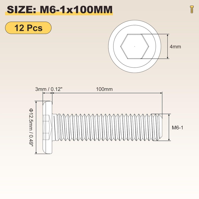 - [2]:SPECIFICATION - Thread Diameter: M6-1(Thread Dia x Pitch); Screw Length: 100mm; Head Size: 3 x 12.5mm/0.12 x 0.49inch(H*D); Hex Width: 4mm; Color: Black; Material: 304 Stainless steel