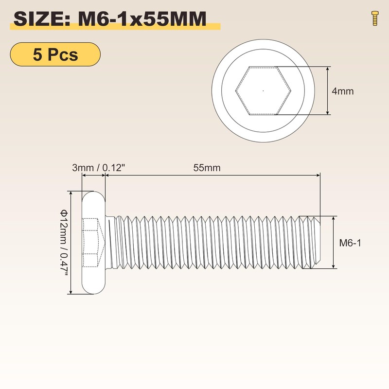 - [2]:SPECIFICATION - Thread Diameter: M6-1(Thread Dia x Pitch); Screw Length: 55mm; Head Size: 3 x 11mm/0.12 x 0.44inch(D*H); Hex Width: 4mm; Color: Yellow; Material: Carbon Steel