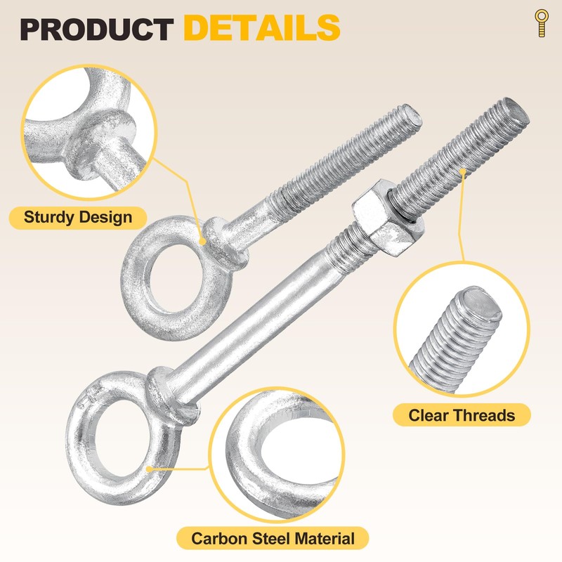 - [1]: APPLY TO - Eye Bolts are rigging fasteners with a circular ring, which are suitable for lifting, suspending, and securing loads in industrial, construction, logistics, and DIY applications. Commonly used for hoisting machinery, warehouse rigging, stage lighting setups, RV/marine anchoring, and home projects like hammocks or swings.