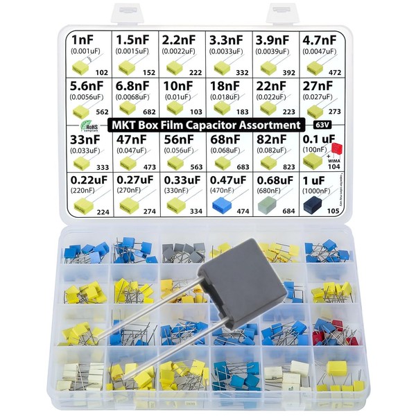 - includes: 33nF, 47nF, 56nF, 68nF, 82nF, 0.1uF, 0.22uF, 0.27uF, 0.33uF, 0.47uF, 0.68uF, 1uF