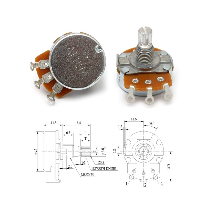 Metallor Alpha Pots Log A250k Volume Audio Potentiometer Electronics for Electric Guitar or Bass Guitar. (Larger A250k)