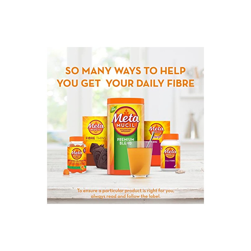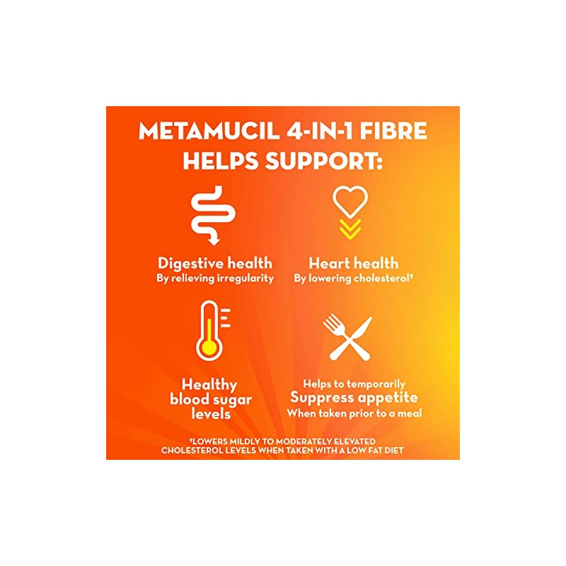 Metamucil 4-in-1 MultiHealth Fibre made with naturally sourced psyllium fibre:-Helps to temporarily suppress appetite when taken prior to a meal: as the psyllium fibre in Metamucil powder thicken, it forms a gel, which aids in the sensation of fullness.-Helps lower cholesterol levels* to promote heart health: Metamucil provides an easy way to help reduce your risk of heart disease by adding psyllium fibre to your heart-healthy diet.-Promotes digestive health**: The psyllium fibre in Metamucil helps maintain regularity.To ensure this product is right for you always read and follow the label.*Lowers mildly to moderately elevated cholesterol levels when taken with a low fat diet.**By relieving irregularity.
