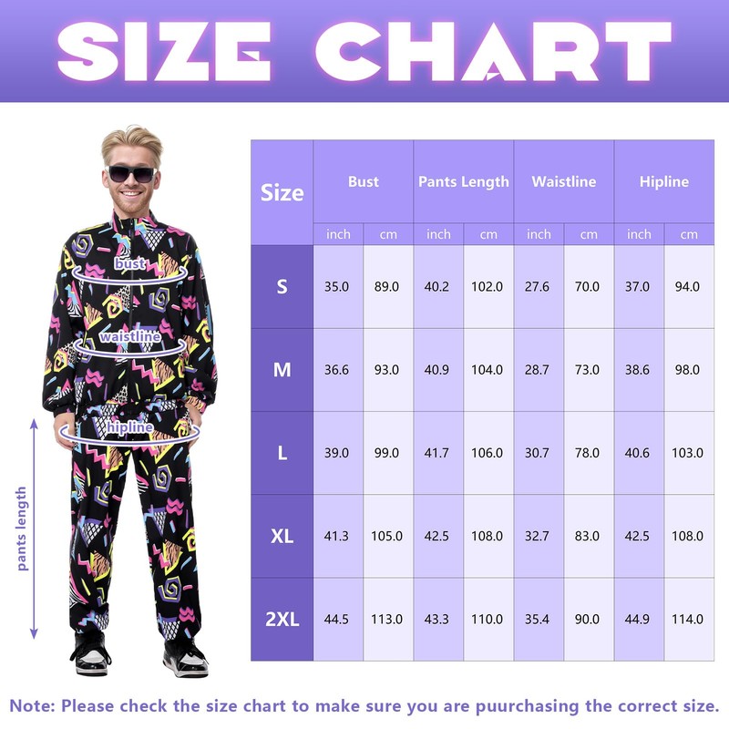 - 【About size chart】:Our 80s Fancy Dress Costume Provide five kinds of size S-XXL, we will provide you with the corresponding size chart, in order to be able to buy the 90s Fancy Dress Costumes suitable for you, you can refer to our size chart before you buy, have any questions you can contact us directly, we will reply to you in the first time after we see, thank you!