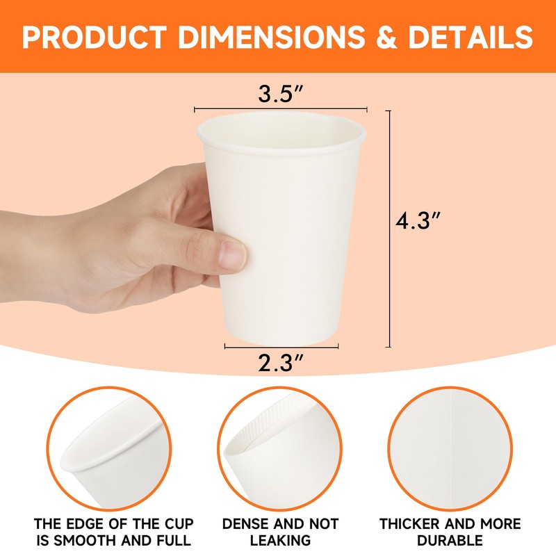 - Coffee Cups 12 oz: This package includes 100 count 12 oz disposable paper cups, ideal for beverages, juice, and coffee. The tightly rolled rim ensures clean sipping, and the classic white color fits any setting