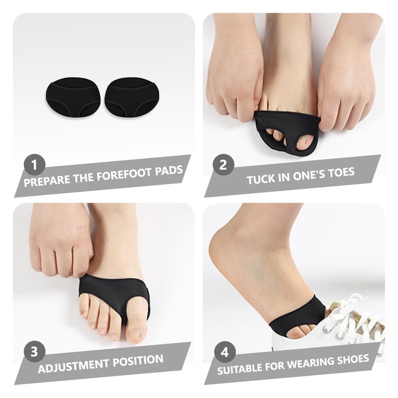 - Choose the size that suits you best: the forefoot pads are moderately thick, which ensures comfort but does not affect the wear of the shoes. However, we still recommend wearing them in your loose shoes to avoid discomfort on your feet due to compression