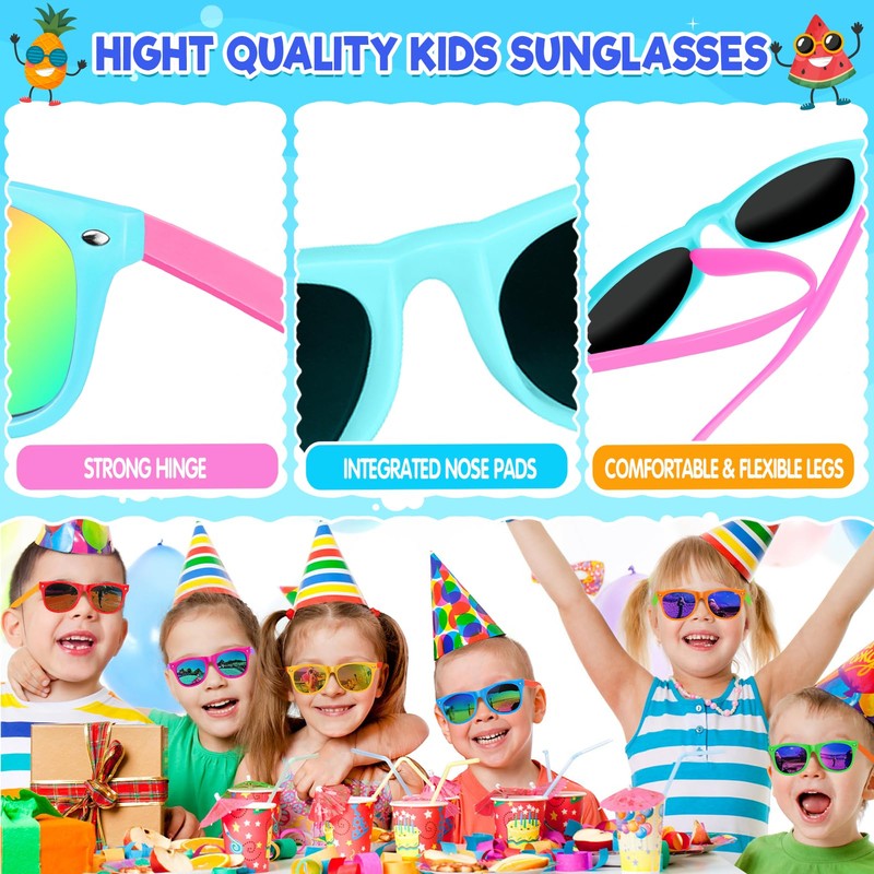 - 【Colorful Design Sunglasses For Kids】 Metemot kids sunglasses party favors for kids 4-8 & 3-5 feature six kinds of vibrant lenses that reflect stunning, eye-catching colors. hese toddler sunglasses show different colors in different sunlight conditions, ensuring your child looks effortlessly cool. Perfect for any summer party occasion, these kids party favors are designed to make both girls and boys stand out with style.