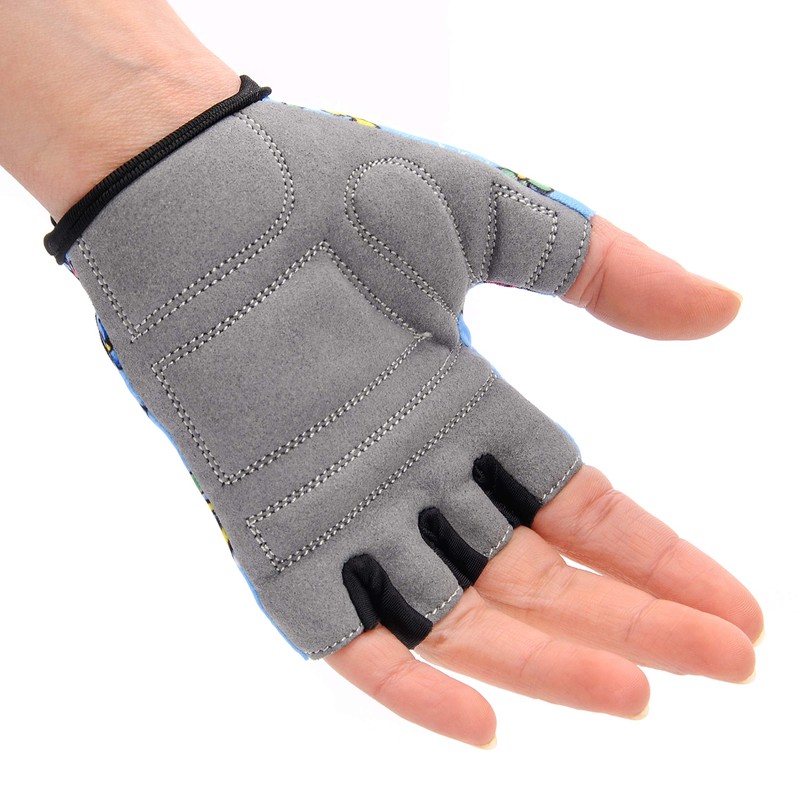 - Children's cycling gloves with short fingers. In the inner part of the hand made of delicate, soft eco-leather. The fabric is complemented by foam inserts softening shocks. In the outer part made of soft material with a colour print.