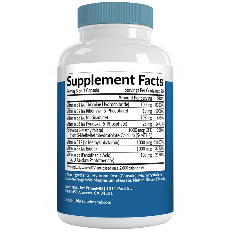 Eight Essential B Vitamins: Includes B1, B2, B3, B5, B6, B7, and 1000mcg of Methylcobalamin (B12), offering complete support for vitality and brain power.