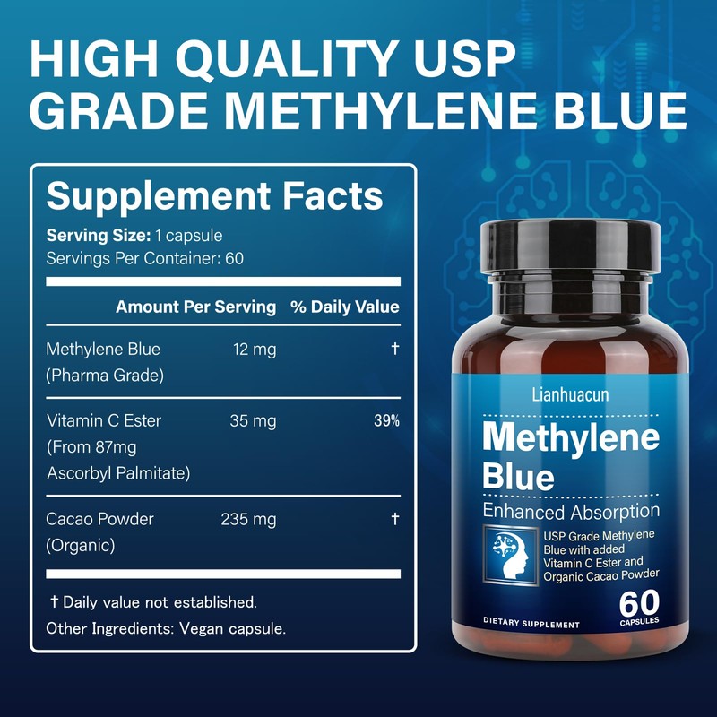 Methylene Blue Pharmaceutical Grade 60 Caps, Methylene Blue Capsules for Humans, with Vitamin C Ester for Better Absorption, Improve Focus and Memory