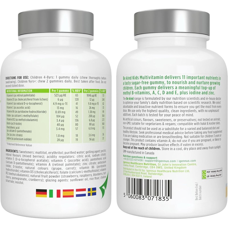 Unser Be kind Kinder Multivitamin liefert wichtige Nährstoffe in leckeren, zuckerfreien Fruchtgummies, zur ergänzenden Nährstoffversorgung von Kindern. Jedes Fruchtgummi enthält eine sinnvolle Menge an Vitaminen und Mineralstoffen, einschließlich aktiver B-Vitamine für Gehirnentwicklung und Lernvermögen, Jod und Zink für Körper im Wachstum und Knochenentwicklung, sowie Vitamine A, C & D zur Unterstützung der Immunfunktion.