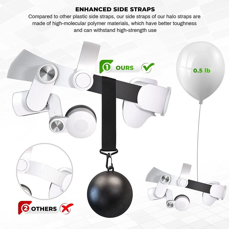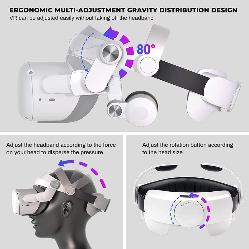 - đăMETORY Adjustable Head StrapăThe Oculus Quest 2 head strap is made of ABS plastic that features lightweight, strong, drop-resistant, and scratch-resistant. Given high-quality materials, the side straps are not easy to deform or break during use and storage.Rotate the knob to easily adjust the size of the head strap.According to gaming needs, you can change the point of force on the head.
