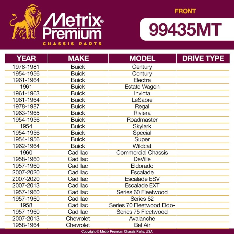 - COMPATIBLE WITH: 78-81 Buick Century, 54-56 Century, 61-64 Electra, 61 Estate Wagon, 61-63 Invicta, 61-64 LeSabre, 78-87 Regal, 63-65 Riviera, 54-56 Roadmaster, 54 Skylark, 54-56 Special, 54-56 Super, 62-64 Wildcat, 60 Cadillac Commercial Chassis, 58-60 DeVille, 57-60 Eldorado, 07-20 Escalade, 07-20 Escalade ESV, 07-13 Escalade EXT, 57-60 Series 60 Fleetwood, 57-60 Series 62, 58 Series 70 Fleetwood Eldorado, 57-60 Series 75 Fleetwood, 07-13 Chevrolet Avalanche, 58-64 Bel Air, 58-64 Biscayne
