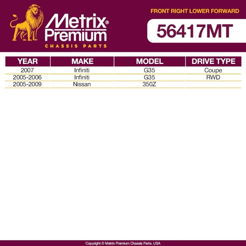 METRIX PREMIUM CHASSIS PARTS Front Right Lower Forward Control Arm for 05-09 Nissan 350Z 05-07 Infiniti G35