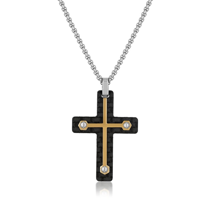 - VERSATILE, ELEGANT AND TRENDY - This carbon fiber cross pendant necklace for him features smooth ends for a distinctive look. The gold ion plated stainless steel cross pendant, suspends from a 24 inch round box chain. Beautifully crafted, suitable for any occasions and perfect to match your outfit