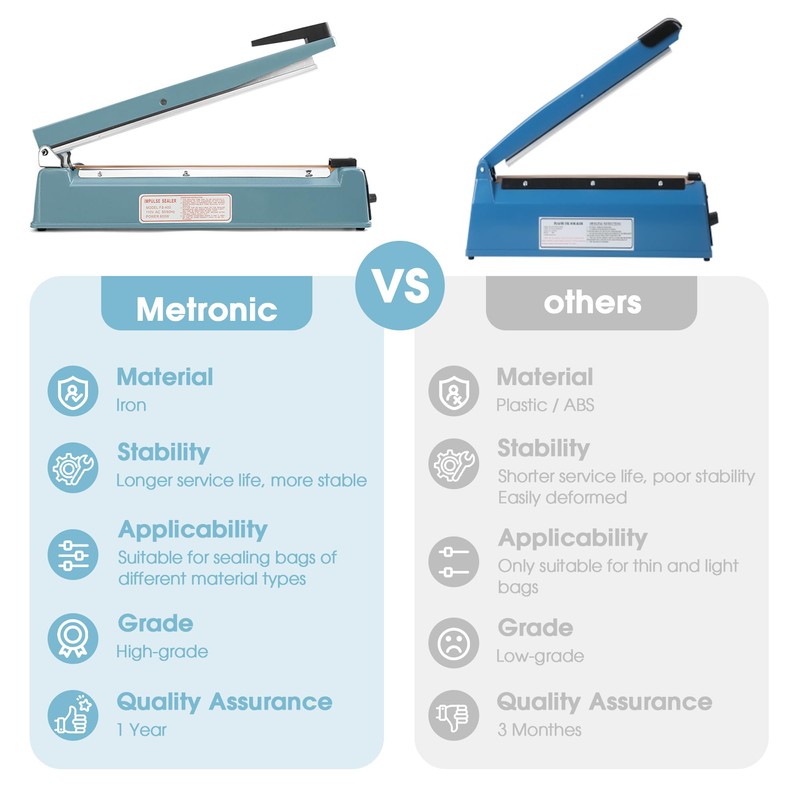 - Safe and Easy to Use --- Metronic impulse sealers are safe and easy to use. The heating element in the impulse sealer is not constantly heated. The light will turn on when the sealer is activated and will turn off once sealing is completed.