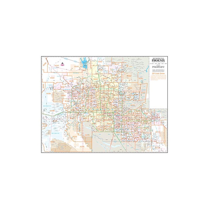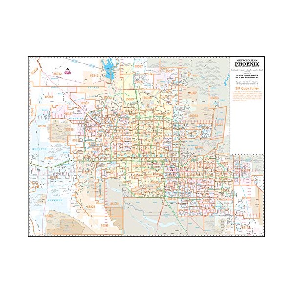 Phoenix Mapping Metropolitan Phoenix Arterial and Collector Streets Full-Size ZIP Code Wall Map is a 47" × 36" wall map of the ZIP codes and major and intermediate streets in the Phoenix metropolitan area. View the entire metropolitan area on a single dry erase laminated sheet that clearly shows the latest ZIP code boundaries.