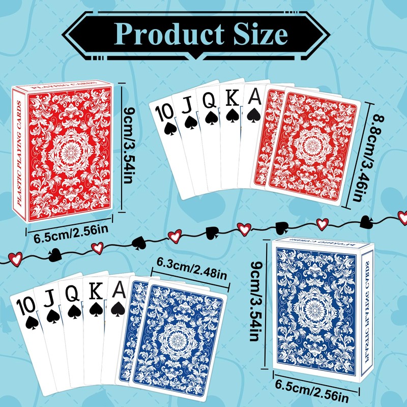 - Playing Cards 12 Pack: You will receive 12 decks of poker size playing cards,with blue and red, 6 for each color. Each deck contains 52 suited cards and 2 jokers, 3.5 in x 2.5 in size (63mm x 88mm). And they are ideal as party favors, birthday or Christmas gifts, stocking stuffers, or simply as a fun addition to family game night