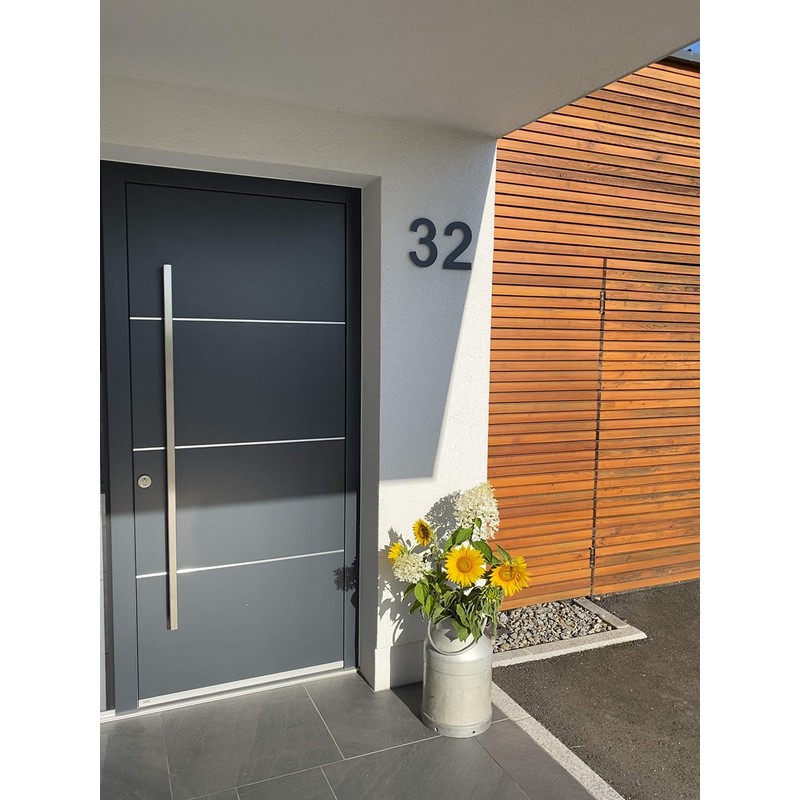 Modern house number in classic font made of stainless steel. For protection against weather and environmental influences in the trendy colour anthracite grey, RAL7016 powder-coated. Thanks to the powder coating of the house number, the numbers are resistant to wind, rain and other environmental influences. The house numbers are made in Germany. The anthracite colour stands out from the exterior colour of the plaster and is therefore easily visible from a distance. Thanks to the spacers welded to the back, the house number stands out from the facade and creates a 3D effect.