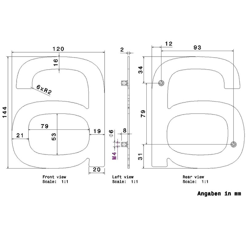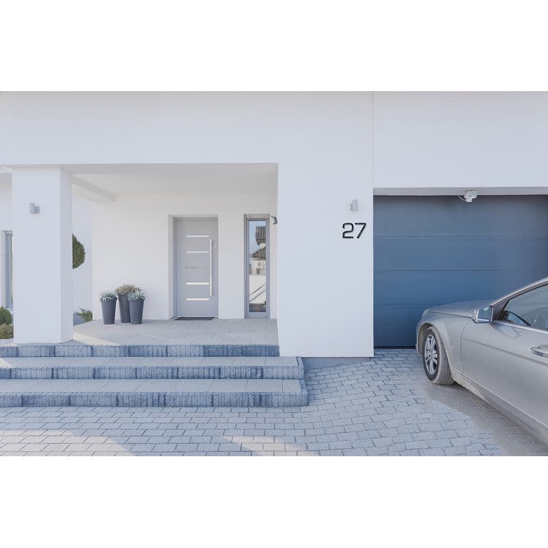 For mounting the house number, 2 holes are drilled in the facade per number. Then the dowels are inserted into the holes. The house number is then pressed into dowels with the threaded screws on the back.