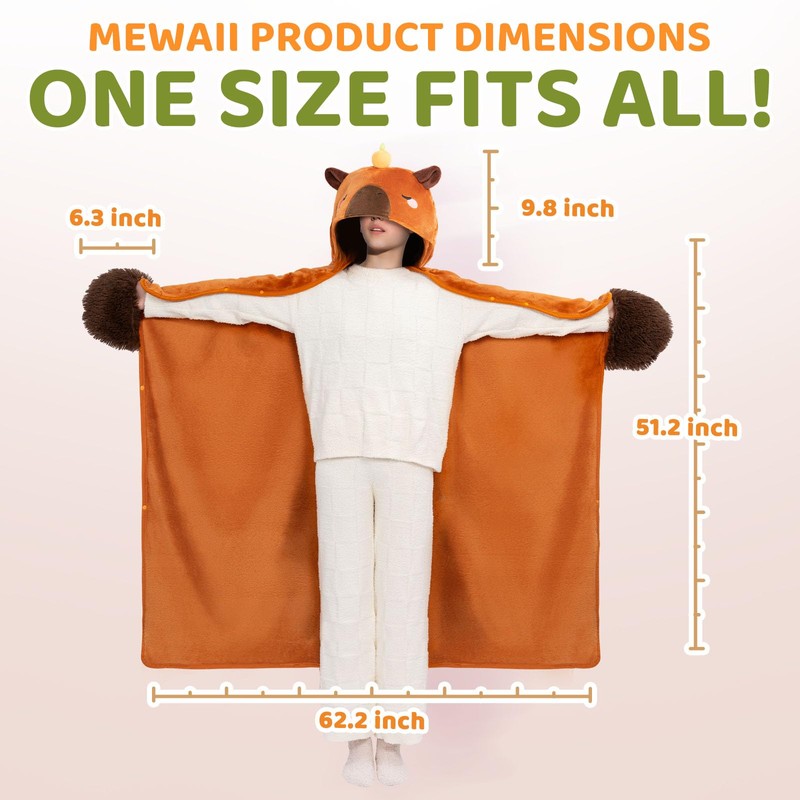 - ONE SIZE FITS ALL: Our wearable capybara blanket is thoughtfully designed to fit most shapes and sizes, making it perfect for everyone. With dimensions of 62" x 52", this oversized capybara blanket provides full-body coverage and warmth, ensuring comfort from head to toe whether you're relaxing at home or on the goanother reason it's the perfect capybara gift.