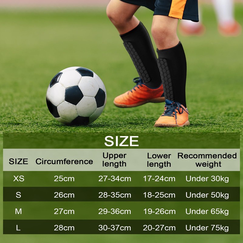 - Product details and size: Our shin pads products are mainly made of bumper pads/nylon/Lycra/silicone, there are four sizes to choose from (XS/S/M/L) and weigh about 65 g