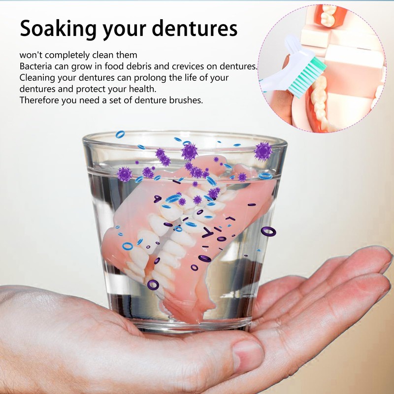 - 【Double-Sided Toothbrush】Our denture cleaning brush use double-sided multi-bristle brush heads. The main large brush head and small brush head provide dual cleaning functions. The large brush head can remove surface debris and particles, and the small brush head can clean deep gaps and cracks, ensuring effective cleaning of the surface and inside of the teeth.