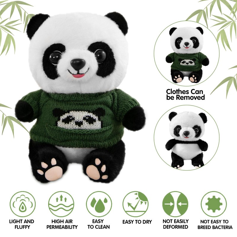 - Panda plush toy: This cute cuddly toy panda is 25 cm long. The large eyed panda plush toy wears small clothes and is innocent and cute. It gives people a better feeling, Panda bear cuddly toys are available in green jumper, blue sweater and red sweater and give people different feelings.