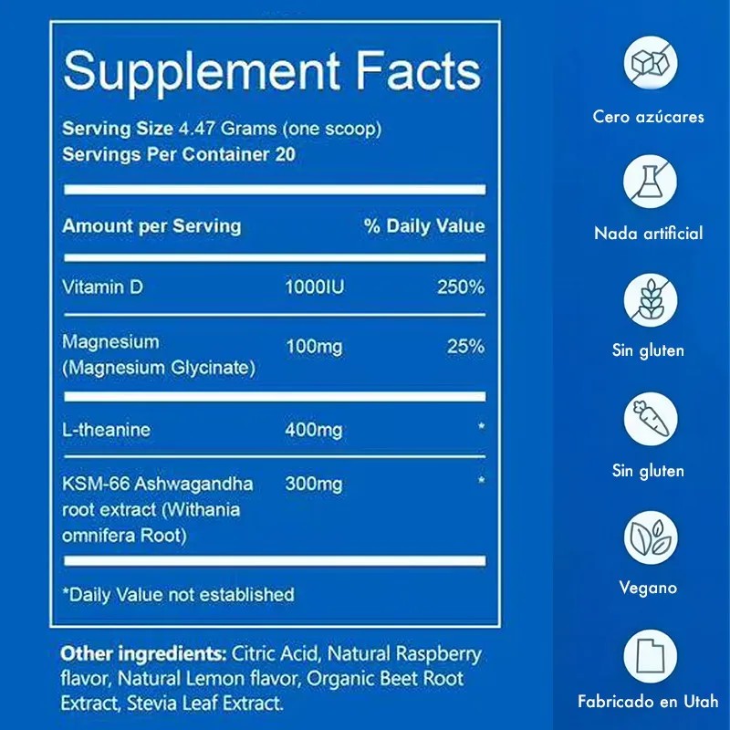 Beneficios: El producto busca ayudar a gestionar el estrés diario, la ansiedad y a promover un estado de calma. El magnesio ayuda a relajar los músculos y a calmar el sistema nervioso, mientras que el KSM-66 ayuda a regular el cortisol, la hormona del estrés. La combinación de ambos puede ser efectiva para mejorar el estado de ánimo y facilitar un sueño más reparador.
