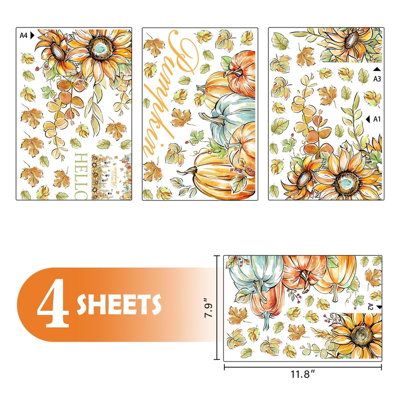 Mfault Fall Hello Pumpkin Sunflower Window Clings 4 Sheets, Autumn Thanksgiving Flower Maple Leaves Stickers Decals Decorations, Floral Farmhouse Home Kitchen Decor