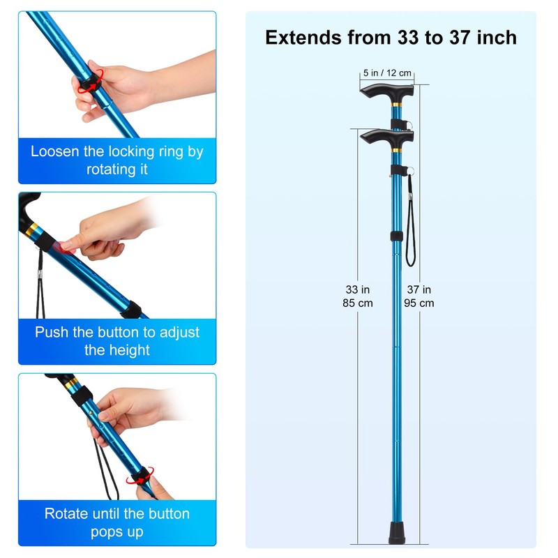 - Our Folding Cane can be easily folded into 4 sections with a length of 10 inches for convenient storage and travel. It can be securely flipped back out for safe use, making it perfect for men, women, elderly, disabled individuals, and for use both indoors and outdoors