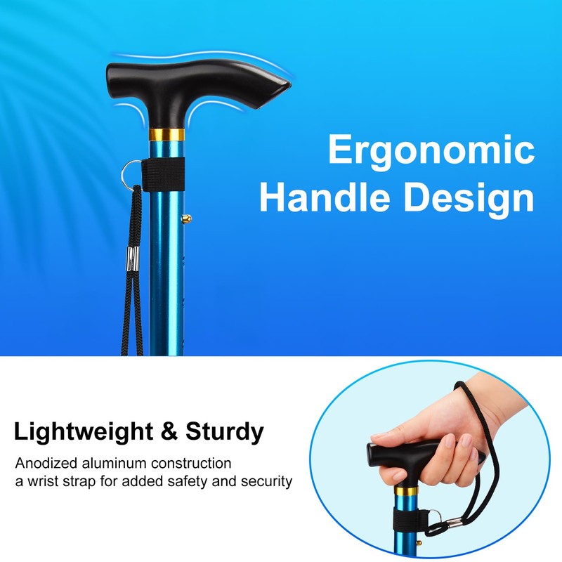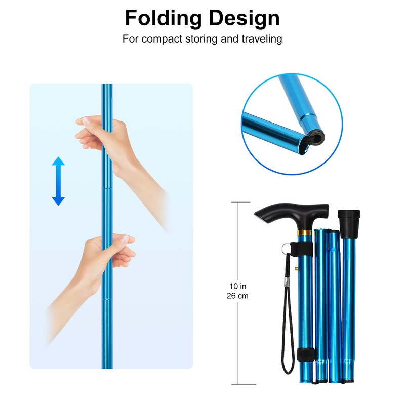 MFE Folding Cane, Portable 5-Level Adjustable Height Walking Stick with Foldable Design, Wrist Strap, and T Handle for Men and Women, Blue