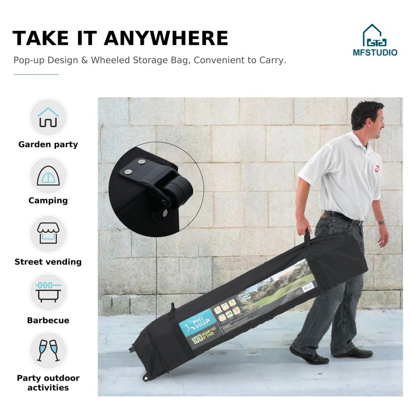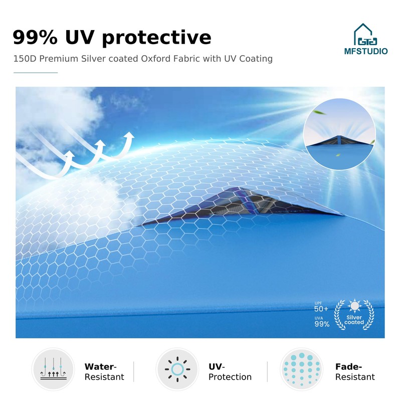 - 【50+ UV sun protection】Made of 150D Oxford fabric, provides 99% UV protection, strong and water resistant. With D ring on corner, easy to fix a guy rope.MFSTUDIO Pop Up Canopy are fire resistant treated to Meet fire code CPAI-84